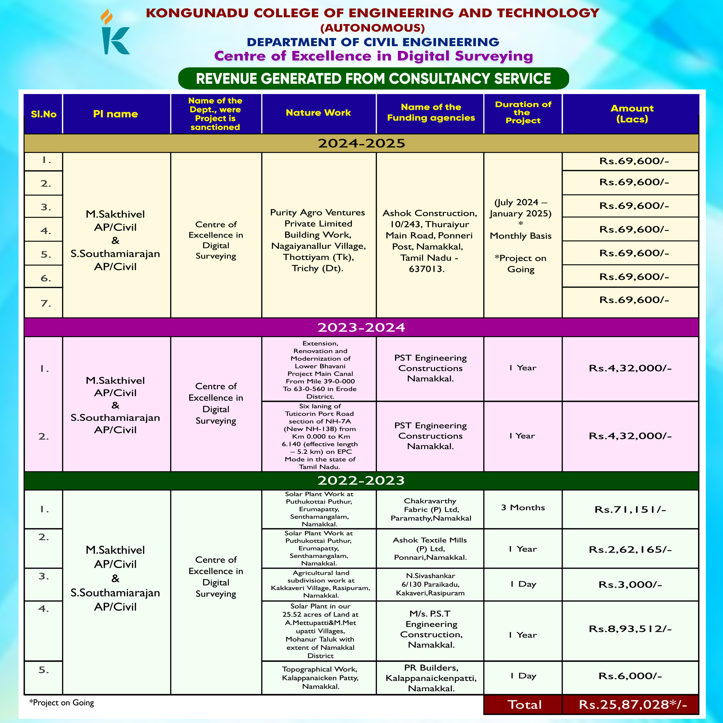10. | April 2025 | Ashok Construction, Namakkal. | Purity Agro Ventures Private Limited Building work | M.Sakthivel S.Southamirajan AP/Civil | Rs.69,600/- |